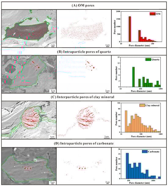 Intraparticle pores are notably prevalent within carbonate and quartz particles (Figure 4D,E). For carbonate minerals, intraparticle pores typically manifest as circular or triangular structures, with pore sizes generally measuring in the hundreds of nanometers or micrometers, likely formed through dissolution processes [71]. Meanwhile, intraparticle pores within quartz particles primarily adopt an isolated circular configuration, characterized by small, disjointed pore sizes. These intraparticle pores might represent fluid inclusions that were unveiled through ion milling [12,34,72]. The number of intraparticle pores is relatively small (with diameters between 50 and 500 nm), resulting in a wide and uneven distribution of pore sizes (Figure 8). Moreover, intraparticle pores are typically larger than interparticle pores, and they are scattered within the mineral particles, resulting in greater spacing and relatively poor connectivity.