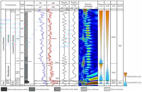 The natural gamma curve (GR) of well YC1 within the study area has undergone wavelet analysis. Figure 3 depicts the resultant wavelet scalogram derived from the wavelet transformation, where blue–green hues indicate lower values, and yellow–red hues signify higher values. Observing the wavelet scalogram, it becomes apparent that a distinct two-stage color transition at the scale a = 250 is predominantly indicative of substantial, large-scale sedimentary cycles. This feature proves valuable in demarcating long-term cycles (Figure 3). Additionally, a noticeable cyclic shift emerges at the scale a = 120, offering a useful criterion for segmenting medium-term cycles (Figure 3). Based on the characteristics observed in the change curve of the wavelet coefficient at scale a = 250, along with the corresponding color transition in the wavelet scalogram, two distinct third-order sequences were discerned within the Wufeng–Longmaxi Formation in well YC1. Expanding further, the characteristics exhibited in the change curve of the wavelet coefficient at scale a = 120, alongside the associated color shift in the wavelet scalogram, facilitated the identification of the transgressive systems tract (TST) and highstand systems tract (HST) contained within the third-order sequence (Figure 3). Furthermore, a robust alignment is noted between lithological characteristics, logging curve features, and each sequence boundary, rendering them more distinct and discernible within the GR and SP curves.
