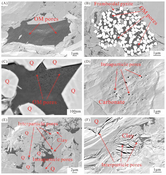 SEM images of different types of pores in the Wufeng–Longmaxi Formation shale samples. (A) Abundant OM pores in the TST1 shale samples. (B) OM filling between framboidal pyrite grains, with abundant OM pores, TST1. (C) OM filling between biogenic quartz particles, with abundant OM pores, TST1. (D) Intraparticle pores within carbonate minerals, TST2. (E) Intraparticle pores within detrital quartz grains, and interparticle pores at the contacts of quartz and pyrite grains, TST2. (F) Interparticle pores at the contacts of detrital quartz grains and clay minerals, HST2. OM, organic matter; Q, quartz.