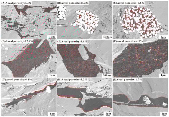(3) Striped OM: Striped OM typically presents an irregular striped distribution within the matrix (Figure 5G–I). Based on its morphological characteristics, it is suggested that this type of OM may be graptolite. This observation aligns with findings by Yang et al. and Delle Piane et al. [69,70], who also noted the absence of developed OM pores in graptolites from the Wufeng–Longmaxi Formation shale, consistent with SEM observations in this study. This type of OM primarily develops shrinkage cracks only at the edges of particles, with areal porosity ranging from 0.0% to 6.4%, averaging 0.9% (Figure 6A).