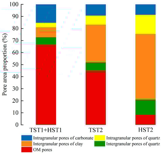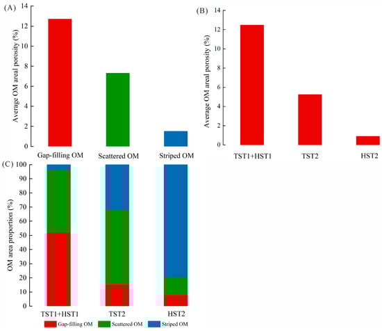 The TST1 and HST1 shale samples predominantly consist of gap-filling OM and scattered OM (accounting for 90%), with an average OM areal porosity of 12.5% (Figure 6B,C). In this section, OM pores in the shale are the most abundant (with diameters between 8 and 50 nm), contributing the most to the pore area (Figure 8 and Figure 9). The number of intraparticle pores is secondary, primarily dominated by intraparticle pores within carbonate minerals. Interparticle pores are the least numerous, primarily found within clay minerals (Figure 8 and Figure 9). The TST2 shale sample is predominantly composed of scattered OM and striped OM (80%), with an average OM areal porosity of 5.2% (Figure 6B,C). In this section, OM pores in the shale are the most numerous (with diameters between 8 and 50 nm), contributing the most to the pore area (Figure 8 and Figure 9). Interparticle pores are secondary, primarily dominated by interparticle pores within clay minerals, while intraparticle pores are less prevalent, primarily found within carbonate minerals (Figure 8 and Figure 9). The HST2 shale sample mainly consists of striped OM (80%), with an average OM areal porosity of 0.9% (Figure 6B,C). In this section, the number of OM pores in shale samples is relatively small, with a predominant development of interparticle pores (with diameters between 50 and 200 nm), primarily dominated by interparticle pores within clay minerals (Figure 8 and Figure 9). OM pores are the dominant pore type in TST1 and HST1, contributing over 65% to the total porosity. Similarly, OM pores are also the dominant pore type in TST2, contributing over 45% to the total porosity. In HST2, the dominant pore type is interparticle pores in clay minerals, contributing over 50% to the total porosity (Figure 9).