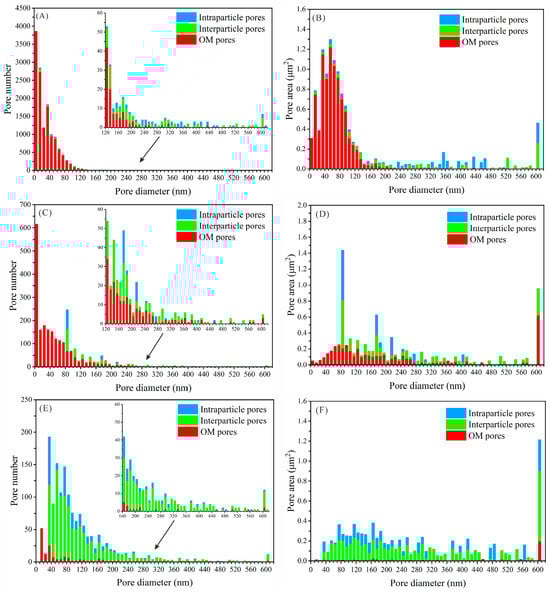 Quantity and pore area distribution of various pore types obtained by image analysis. (A,B) are from TST1 + HST1; (C,D) are from TST2; (E,F) are from HST2).
