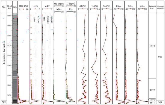 Through the assessment of U/Th, V/Cr, MoEF, and UEF, it can be inferred that the deposition of TST1 and HST1 intervals took place under suboxic conditions, whereas the deposition of TST2 and HST2 intervals occurred under oxic conditions (Figure 10). Additionally, the Mo and U contents in the HST2 interval are lower compared to those in the TST2 interval, approaching levels identified in PAAS shale. This implies a greater degree of bottom water oxidation during HST2 deposition than during TST2. By evaluating CuXS, NiXS, and ZnXS, it is possible to infer that paleoproductivity during the TST1 and HST1 periods was relatively high, medium during the TST2 period, and relatively low during the HST2 period. MoEF, UEF, U/Th, V/Cr, CuXS, NiXS, and ZnXS exhibit the same vertical change trend as TOC (Figure 10), indicating a strong positive correlation between these factors and TOC. This suggests that the enrichment of OM is influenced by both paleoproductivity and paleoredox conditions. Previous studies have demonstrated that OM accumulation is governed by production and preservation, and high paleoproductivity and anoxic conditions can enhance OM accumulation [73].