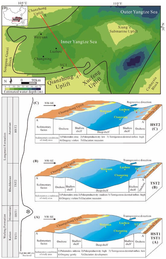 (A–C) The sequence stratigraphic evolution model of the Wufeng–Longmaxi Formation in the study area (modified from [75]). (D) Palaeogeographic map during the Mid-Hirnantian period (modified from [76]).