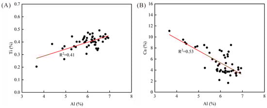 (A) Relationship between Al and Ti for the shale samples from the Wufeng–Longmaxi Formation. (B) Relationship between Al and Ca for the shale samples from the Wufeng–Longmaxi Formation.