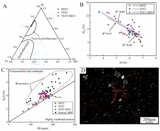 Silicon source discrimination diagrams. (A) Al–Fe–Mn ternary plot. (B) Relationship between Al and Siex. (C) Relationship between K2O and Rb (K2O and Rb concentrations of bentonites are from [87]). (D) Radiolarians in the shale samples from the Wufeng–Longmaxi Formation.