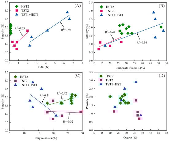 Relationship between TOC content, carbonate minerals, clay minerals, quartz, and porosity for the shale samples from the Wufeng–Longmaxi Formation. (A) Porosity vs. TOC content. (B) Porosity vs. carbonate minerals content. (C) Porosity vs. clay minerals content. (D) Porosity vs. quartz content.