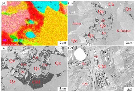 According to the shape, size, and CL intensity of quartz, the type of quartz can be determined. Previous studies have demonstrated that the CL intensity of terrigenous quartz is stronger than that of authigenic quartz [79,80]. SEM observations indicate that the quartz particles in TST1 and HST1 shales are mostly small, appearing as aggregates and symbiotic with OM, with weak CL intensity (Figure 13A,B). This suggests that the quartz in this shale section is primarily authigenic. On the other hand, the quartz particles in TST2 and HST2 shales are mostly large and irregular in shape, exhibiting strong CL intensity (Figure 13C,D). These observations indicate that the majority of quartz in this interval is terrigenous quartz. Furthermore, the calculation results reveal that the average Siex content of TST1 and HST1 shales is the highest, indicating a high content of authigenic quartz in this section. In comparison, the average Siex content in TST2 and HST2 shale samples decreased, suggesting a reduction in the content of authigenic quartz when compared to TST1 and HST1.