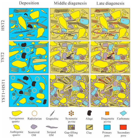 The correlation between TOC and carbonate minerals in TST2 shale shows a positive relationship with porosity, but this correlation is weaker compared to that of TST1 and HST1 shale (Figure 15). TST2 shale predominantly consists of scattered and striped OM, whereas TST1 and HST1 shale mainly contain gap-filling OM (Figure 6C). Statistics reveal that the areal porosity of scattered and striped OM is generally lower than that of gap-filling OM. Therefore, it is believed that the change in OM type is the primary reason for the attenuation of the correlation between TOC and porosity in TST2 shale. Due to the lower OM content in this interval, there is a reduction in the generation of organic acids during OM pyrolysis, leading to a decrease in the formation of dissolution pores in carbonate minerals (Figure 9). Consequently, the correlation between carbonate minerals and porosity weakens. In comparison to the TST1 and HST1 intervals, the shale samples within this interval contain an increased amount of terrigenous detrital minerals, primarily clay minerals and terrigenous quartz. The interparticle pores within clay minerals contribute more significantly to porosity (Figure 9). Terrigenous quartz is often observed in isolated particle forms within the shale matrix and is surrounded by clay minerals, making a lesser contribution to porosity.