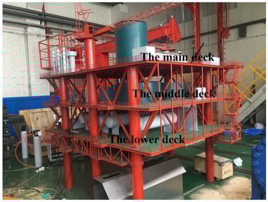 As shown in Figure 1, an experimental system concerning the gas release and dispersion on an offshore platform is designed. On the whole, the experimental system includes a gas leakage module, a data acquisition module, and the experimental offshore platform. The gas leakage module serves to obtain the required release rate. The data acquisition module helps to monitor the variation in the gas concentration. The experimental offshore platform (Figure 2) is constructed based on a real offshore platform. The basic dimensions of the experimental offshore platform are summarized in Table 1.