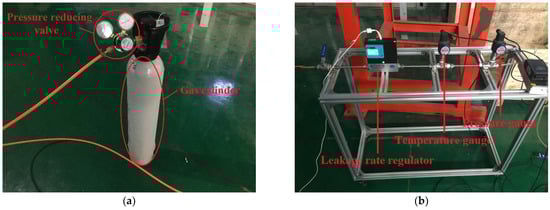 Some devices of the gas leakage module. (a) The gas cylinder with pressure reducing valve. (b) The leakage rate regulator, pressure gauge, and temperature gauge.