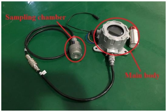 The data acquisition module mainly includes the gas detector, RS485 communication interface, and PC software. The gas detector is used to analyze the gas concentration. The gas detector adopts the infrared absorption principle. The sampling methods of gas detectors mainly include pump suction sampling and natural dispersion sampling. Pump suction sampling affects the dispersion behavior of the released gas and greatly disturbs the monitoring accuracy, especially for trace gas leakage scenarios. As for natural dispersion sampling, the gas migrates freely into the chamber of gas detectors, which has little effect on the dispersion behavior. Therefore, natural dispersion sampling is exclusively adopted in this data acquisition module. Similarly, the fixed gas detector rather than the portable gas detector is chosen to prevent turbulence intensity from being disturbed. For ease of installation and debugging, the gas detector is customized by separating the sampling chamber from the main body of the gas detector, as shown in Figure 4.