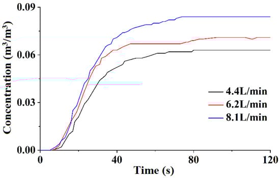 A total of three constant leakage rates, including 4.4 L/min, 6.2 L/min, and 8.1 L/min, are considered to discuss the dispersion behavior of the released gas. Figure 6 presents the transient gas concentration at monitor # 1 under different leakage rates. As can be seen, the released gas is detected about 7 s after the gas leakage in different scenarios. The gas concentration increases continuously and then reaches a preliminary stable state. The gas concentration then increases slightly and finally stabilizes due to the sedimentation of propane gas. The steady-state gas concentrations in different scenarios, from big to small, are 8.4%, 6.8%, and 6.3%, respectively. Obviously, the maximum concentration increases as the leakage rate increases. This phenomenon is attributed to the fact that the dilution performance is limited by the leakage rate, and the dilution performance becomes worse with the increase in the leakage rate.