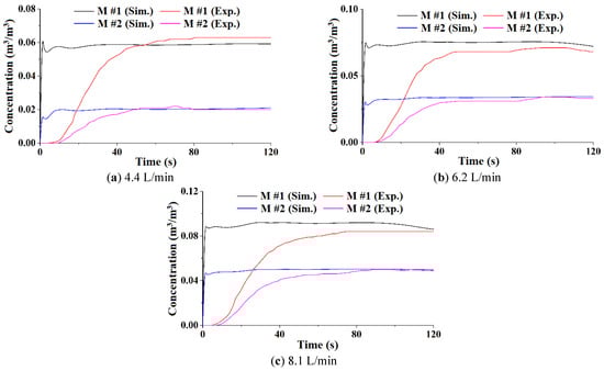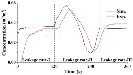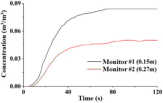 In the experiment, the sampling area of the gas detector has a diameter of approximately 6 mm. The monitor is associated with an exact coordinate in the numerical simulation. Therefore, a matrix of monitors is set up within the sampling area of the gas detector in the numerical simulation. And the average value of each monitor matrix is utilized to demonstrate the correlation between the experimental results and the numerical simulation results. The monitors with the same coordinates are utilized to demonstrate the correlation between the experimental results and the numerical simulation results. Figure 12 presents the variation in the gas concentration during the experiment and the numerical simulation. As can be seen, a similar trend of first increasing and then stabilizing is also observed in the numerical simulation. The differences are that the released gas is detected in a very short time, and the time required to reach stability is dramatically reduced in the numerical simulation. The differences between them are mainly embodied as follows: