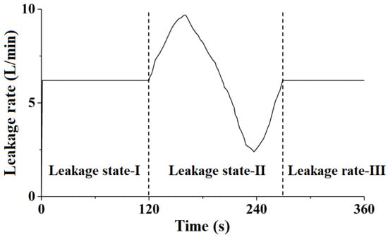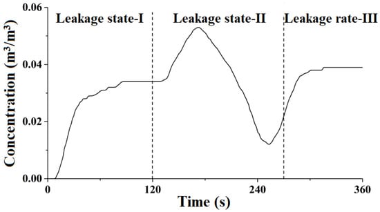 This section deals with the gas release scenario with a time-varying leakage rate. As can be seen from experiments with constant leakage rates, both the leakage rate and the gas concentration are lower than the set value in the initial stage. Therefore, a constant leakage rate of 120 s is thereby set in the initial stage. The leakage rate is then set to be time-varying by adjusting the leakage rate regulator. Figure 8 presents the fully transient leakage rate adopted in this section. Overall, the leakage process lasts for 360 s. During 0–120 s, the leakage rate remains constant at 6.2 L/min, and this process is defined as leakage stage I. During 120–270 s, the leakage rate is time-varying, and this process is defined as leakage stage II. The occurrence time of the extremum of the leakage rate is 159 s and 237 s, respectively. The 270–360 s is leakage stage III, and the leakage rate remains constant at 6.2 L/min in this stage.