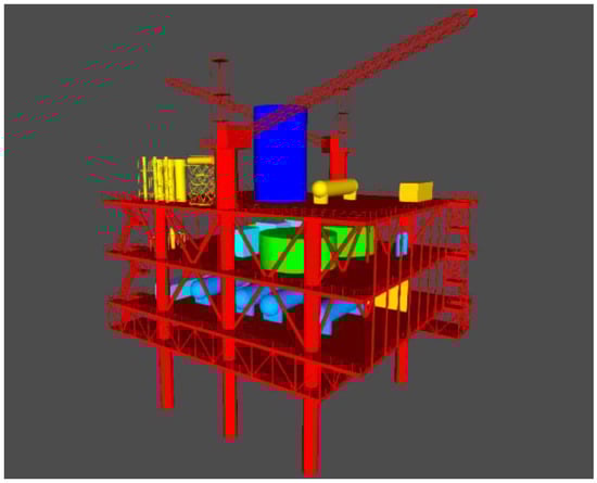 The experimental scenarios are expected to be replicated by the numerical model. The dispersion of the released gas is affected by the obstacles and thereby it is of great importance to reproduce the geometric features as accurately as possible. A good description of the geometric model is one of the key elements in the numerical calculation. Therefore, a 1:1 geometric model is established based on the target offshore platform. Every geometric detail is taken into account to ensure consistency between the experiment and the numerical calculation. The final as-built 3D geometric model of the offshore platform is illustrated in Figure 10.