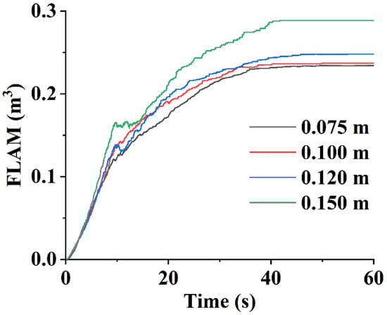 Figure 16 depicts the variation in FLAM in this scenario. As can be seen, FLAM presents a trend of first increasing and then decreasing. This phenomenon is attributed to the variation in the leakage rate and the dilution in the ventilation. The dilution performance of the ventilation is inadequate for the initial leakage rate, so the FLAM shows an increasing trend before the ESD starts. The leakage rate decreases continuously after the ESD starts. Ventilation plays an increasingly important role by increasing the lean part of the released gas. As a result, the FLAM decreases after a short increase.