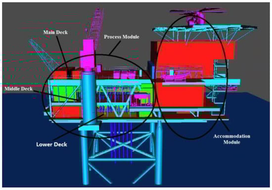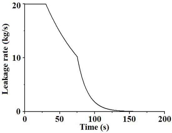 In this section, a fine geometric model of the target offshore platform is built based on the construction data (Figure 14). Generally, the ESD system and the blowdown system will start sequentially when there is an accidental gas release on offshore platforms. The leakage rate remains unchanged before the ESD starts. Then, the leakage rate decreases exponentially due to depressurization. The starting time of the ESD system and the blowdown system is 30 s and 80 s, respectively, after the gas release [21]. The transient leakage rate profile is calculated accordingly [16], as shown in Figure 15.