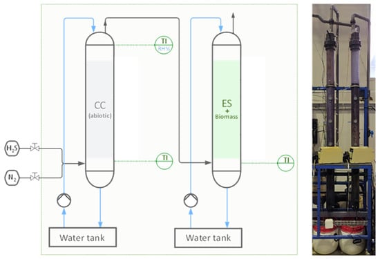 The experimental setup is displayed in Figure 2. Two packed bed columns were operated in series. Cylindrical polyvinyl chloride columns (internal diameter of 10 cm) were packed with 7.8 L (corresponding to 1 m height) of their respective packing materials. First, the gas circulated through the packed bed of cellular concrete (CCAF), and then passed through the BTF packed with expanded schist. CCAF was humidified by a drop-by-drop system (flow rate 27 mL min−1), while the BTF was continuously sprinkled with water (flow rate 114 mL min−1). For both columns, water was circulated from top to bottom in a closed loop between the water tank and the column, while the gas circulated from bottom to top (countercurrent flow) in an open loop. The BTF water was renewed regularly (approximately once a week) to ensure sulfate accumulation did not reach values greater than 12 mg S-SO42− gmaterial−1, corresponding to an electrical conductivity of 10 mS cm−1 [21]. Exceeding this limit leads to a negative impact on the bacterial population, which leads to a significant decrease in efficiency. The expanded schist filling the BTF was inoculated with 4 L of activated sludge from a wastewater treatment plant (Procanar, Lauzach, France), but no nutritive solution was added to the water since it was assumed that the minerals contained in the tap water were sufficient for the growth of autotrophic microorganisms. The average properties of tap water were as follows: pH = 8.0–8.8; electrical conductivity = 0.42 mS cm−1; Cl− = 57 mg L−1; Na+ = 34.2 mg L−1; SO42− = 6.6 mg L−1; NO3− = 4.1 mg L−1. A gas containing dinitrogen (N2), dioxygen (O2) and H2S was circulated through the columns. This gas could mimic landfill biogas or household biogas, as dinitrogen replaces methane CH4. A dinitrogen gas generator (BrezzaNiGen LC-MS, Gengaz Company, Wasquehal, France) produced N2 by purifying ambient air. However, a residual O2 concentration could still be measured, and the higher the gas flow rate, the higher the residual O2 concentration. The N2 flow rate was controlled and measured using a mass flowmeter (Model 58500, Brooks Instruments, Hatfield, MA, USA). A stream of H2S (99.7% purity), controlled and measured using another mass flowmeter (Model 5850S, Brooks Instruments, Hatfield, PA, USA), was mixed with the N2 flow prior to entering the CCAF. Each column was equipped with sampling ports located at the inlet and outlet for H2S concentration measurement (Cin and Cout) and performance determination (Table 1). Thermocouples (K type) were installed on each column to measure the inner temperature on several measuring points, as described in Figure 2.