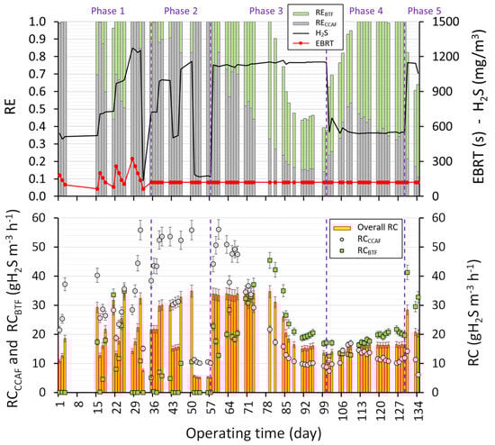 Figure 3 shows the performance of the desulfurization process during the five phases of experiment. During phase 1, the H2S concentration was increased gradually from 500 ± 10 to 1260 ± 20 mg m−3, and different overall EBRTs were applied for each stage (from 64 to 322 s). During this first phase, the overall RE was always higher than 96 ± 4%, with the outlet concentration always being lower than 28 ± 1 mg m−3. At low H2S concentrations, 100% of the incoming H2S was fully treated by the CCAF. For higher concentrations, RECCAF could drop to 60 ± 3%, but the remaining H2S in the gas leaving the CCAF was then removed by the BTF. The desulfurization process coupling the CCAF and the BTF thus ensured total H2S removal. In terms of removal capacity, Figure 3 shows that RCCCAF can reach values higher than 56 ± 3 gH2S m−3 h−1, while RCBTF can therefore be nil since the loading rate was fully treated by the CCAF. These first findings were confirmed during phase 2, in which the overall EBRT was maintained at 120 s (EBRTCCAF + EBRTBTF) and the inlet H2S concentration fluctuated between high (>1000 ± 20 mg m−3) and low values (around 160 ± 3 mg m−3). For this EBRT, the amount of O2 in the gas was around 1.2 ± 0.1% in volume. Similarly to phase 1, the H2S loading rate was mainly treated by the CCAF (RECCAF > 80% and RCCCAF usually higher than 56 ± 3 gH2S m−3 h−1), with the BTF thus acting as a refining system. Consequently, this hybrid desulfurization process in two steps was efficient and able to support sudden increases in concentration. It has to be noted that the maximum value of the overall removal capacity, RC, of the desulfurization process was around 35 ± 2 gH2S m−3 h−1 (Figure 3), i.e., significantly lower than RCCCAF, since volumes of both the CCAF and the BTF must be considered for the calculation. Nonetheless, for an EBRT of 120 s, an RC around 35 ± 2 gH2S m−3 h−1 is in the range of the data from the literature reviewed by Almenglo et al. [5], dedicated to the biological technologies for anoxic biogas desulfurization.