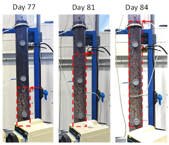To test the resilience of the desulfurization process, the H2S inlet concentration was first abruptly increased from 160 ± 3 to 1150 ± 20 mg m−3 for EBRT = 120 s starting from day 57 and for 43 days (EBRTCCAF + EBRTBTF). During phase 3, the H2S loading rate was 34 ± 2 gH2S m−3 h−1 for the desulfurization process, i.e., 68 ± 4 gH2S m−3 h−1 for the CCAF (EBRTCCAF = 60 s). Then, the H2S inlet concentration was dropped from 1150 ± 20 to 550 ± 10 mg m−3 for EBRT = 120 s from day 100 and for 29 days (phase 4), corresponding to a H2S loading rate of 16 ± 1 gH2S m−3 h−1 for the desulfurization process, i.e., 32 ± 2 gH2S m−3 h−1 for the CCAF. During phase 3, the overall removal efficiency of the desulfurization process was 100% for 22 days, but RECCAF gradually decreased from 100% at day 57 to 33 ± 2% at day 79 (Figure 3). The BTF was then able to compensate for this decrease by processing an increasing H2S loading. This ability of the BTF to handle the loading left by the CCAF is clearly shown by the changes in the RCCCAF and RCBTF curves in Figure 3, which move in opposite directions (between day 60 and day 79), while the overall RC was kept constant at 34 ± 2 gH2S m−3 h−1. At day 79, RCBTF reached a maximum value of 45 ± 3 gH2S m−3 h−1, which is a significant value for a BTF operating at EBRTBTF = 60 s. The increase in the ability of the BTF to treat high loading rates from the CCAF was visually observed from the colonization of the expanded schist by the biofilm (Figure 4). During phase 1, the BTF was colonized by biomass to a height of 43 ± 1 cm, which remained stable during phase 2. But during phase 3, from day 71 onwards, the biomass grew and rapidly colonized the entire height of the packing material. This biomass development related to the increase in the loading rates to be treated led to an increase in the pressure drop of the BTF (∆PBTF around 234 ± 8 Pa m−1 at day 79; Figure 5). This increase in ∆P could also be partly due to the accumulation of elemental sulfur in the BTF since the sulfate production remained unchanged over this period. This value is far larger than pressure drops usually reported in BTF filled with expanded schist (some dozen of Pa m−1) but significantly lower than those obtained using other packing materials, as reported in several studies [28]. From day 81, the performances of both the CCAF and the BTF decreased simultaneously, resulting in a decrease in the overall RE of the desulfurization process. At the end of phase 3, the RE was around 40 ± 3% (overall RC around 14 ± 1 gH2S m−3 h−1), with the part of the CCAF and the BTF being 13 and 27 ± 2%, respectively. It can then be concluded that the BTF was no longer able to compensate for the significant decreases in the performance of the CCAF. Without ruling out a possible limitation due to nutrient depletion or low oxygen mass transfer, it is likely that the removal capacity of the BTF was limited by bacterial inhibitions due to the high loadings remaining to be treated after passing through the CCAF, of the order of 50 ± 3 gH2S m−3 h−1 (EBRTBTF = 60 s). The pressure drop ∆PBTF was then decreased to 45 ± 3 Pa m−1 at day 99. It has to be noted that for the CC abiotic filter, ∆PCCAF was never higher than 10 ± 2 Pa m−1 during the whole experiment (Figure 6). At the end of phase 3, it was possible that the cellular concrete reached its lifetime. The reduction in the loading rate by a factor of 2, achieved by decreasing the H2S concentration during phase 4 (constant overall EBRT = 120 s), resulted in a temporary improvement in the efficiency of the CCAF (RECCAF up to 51 ± 3% at day 108) but without returning to the RECCAF measured during phase 2. After day 108, RECCAF progressively decreased to 35 ± 3%, confirming that CC was losing its capacity to remove H2S. At the same time, the reduction in the loading rate was beneficial to the BTF, confirming the resilience of the desulfurization process, which reached RE = 100% from day 112 to the end of phase 4 (RCBTF around 20 ± 2 gH2S m−3 h−1; Figure 3). During this period, ∆PBTF doubled (from 48 ± 3 to 109 ± 5 Pa m−1; Figure 5), indicating that the BTF runs well in terms of biomass development and H2S removal. The last H2S shock load due to the doubling in the H2S concentration (phase 5) rapidly led to a decrease in the performance of the desulfurization process, similarly to phase 3. During phase 5, ∆PBTF reached 210 ± 7 Pa m−1, close to the values recorded during phase 3.