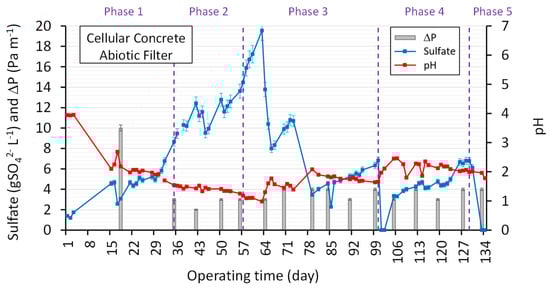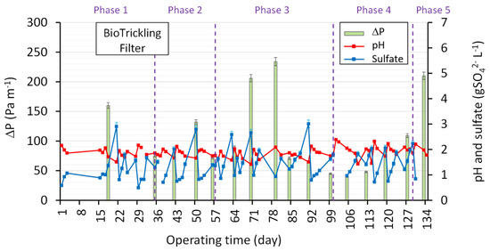Pressure drops (∆P) in the BTF measured between the top and the bottom of the column; pH and sulfate concentration measured in the liquid recirculating the BTF.