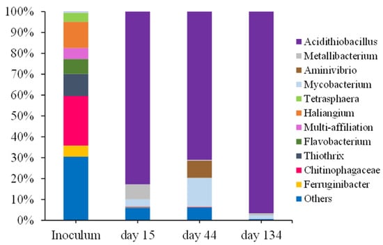 In the presence of oxygen in the gas (1.2 ± 0.1% in volume), the biological reaction products in the BTF are either elemental sulfur (H2S + 0.5O2 → S0 + H2O) or sulfate (H2S + 2O2 → SO42− + 2H+) according to the H2S/electron acceptor ratio. Elemental sulfur production and biomass accumulation lead to an increase in the pressure drops, while sulfate formation lead to a pH decrease [29]. The biomass accumulation due to BTF performance was evidenced by the change in pressure drops, and the presence of sulfate was detected by monitoring the pH and quantified by the sulfate concentration measurement using high-pressure ion chromatography (Figure 5). During the operating period, the pH of the recirculating liquid was maintained at a value higher than 1.5 through regular water renewal (once a week) to avoid sulfate accumulation, which can have a negative impact on the microbial population and the BTF efficiency, as evidenced by Ben Jaber et al. [29]. Consequently, the sulfate concentration continuously ranged between 1 and 3 gSO42− L−1, demonstrating the sulfate production and the fact that the BTF was not oxygen-limited, since the H2S/O2 molar ratio was significantly higher than 2. Regarding the biomass analysis of the microbial communities extracted from the BTF, Figure 7 reveals the enrichment of the biofilm by bacteria belonging to the genera Acidithiobacillus. The presence of these chemolithoautotrophic sulfur oxidizing bacteria (SOB) in large abundance is in agreement with the acidic conditions and consistent with the microbial community analysis reported in the literature dedicated to the desulfurization by BTF, both in aerobic or anoxic conditions [5,13,30]. Consequently, the ability of the BTF to efficiently remove H2S due to the domination of chemolithoautotrophic Acidithiobacillus sp. all along the running of the experiment makes this desulfurization process very robust. Regarding the possible natural colonization of the cellular concrete by microorganisms (the CCAF had not been inoculated), all attempts to extract the biomass from the CCAF failed, and consequently, a biological H2S removal was certainly insignificant in the apparatus.