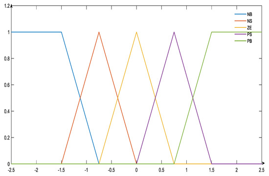 In the smart controller mechanism, the control output is the liquid flow rate increment. The selected input fuzzy variables are error and error change. The fuzzy system defines five linguistic variable values for error and error change, respectively: NB, NS, ZE, PS, and PB. The graph of the membership function is shown in Figure 6.