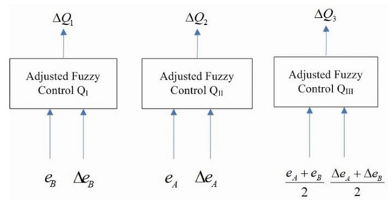 In the preceding part of the reasoning, the Mamdani operator, basic complementary operation, and Mamdani fuzzy reasoning rule are utilized. The velocity in Zone I primarily affects the purity of the extract material B, while the velocity in Zone II mainly influences the purity of the raffinate material A. The effect of Zone IV’s velocity is similar to that of Zone III; hence, Zone III’s velocity is selected as the control variable. The action diagrams of the three independent controllers are shown in Figure 8.