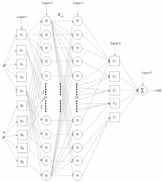As mentioned before, SMB is a very complex nonlinear system. The control of a multi-column SMB system cannot be accomplished independently by one controller. Each feed hole must be equipped with an independent controller for control. The purpose of chromatographic separation can only be achieved through a precise and appropriate feed speed control of the flow rate of the material to be separated. Therefore, how to design a smart controller with learning and self-adjustment abilities is another aim of this study in SMB control applications. In view of this, the smart controller designed in this research combines the characteristics of fuzzy control and neural network (NN) control. It is an NN-like fuzzy controller. It adopts the concept of “ANFIS: adaptive-network-based fuzzy inference system” proposed by J-S.R. Jang as the controller architecture [27,28].