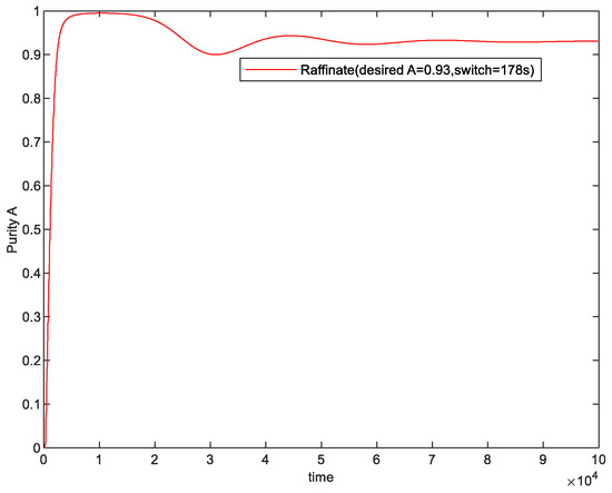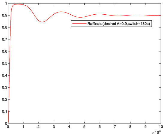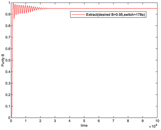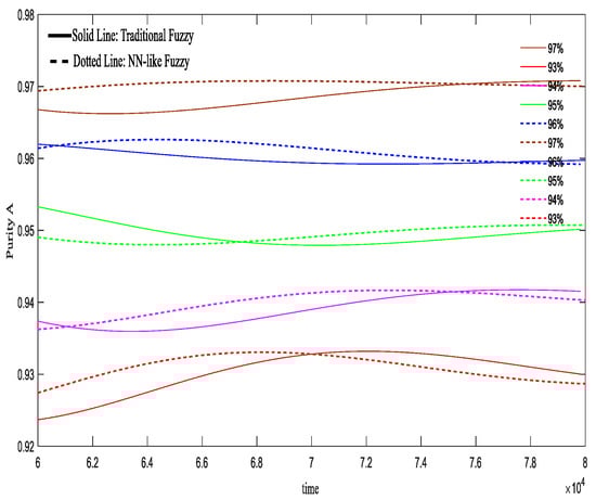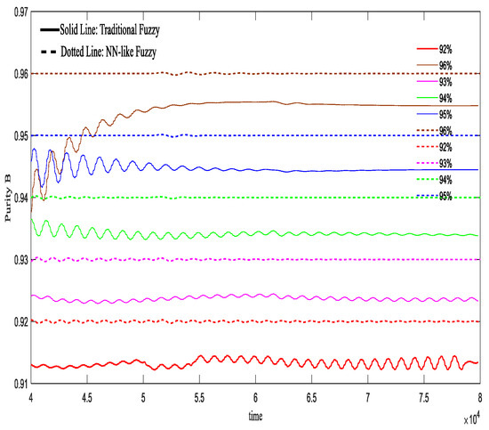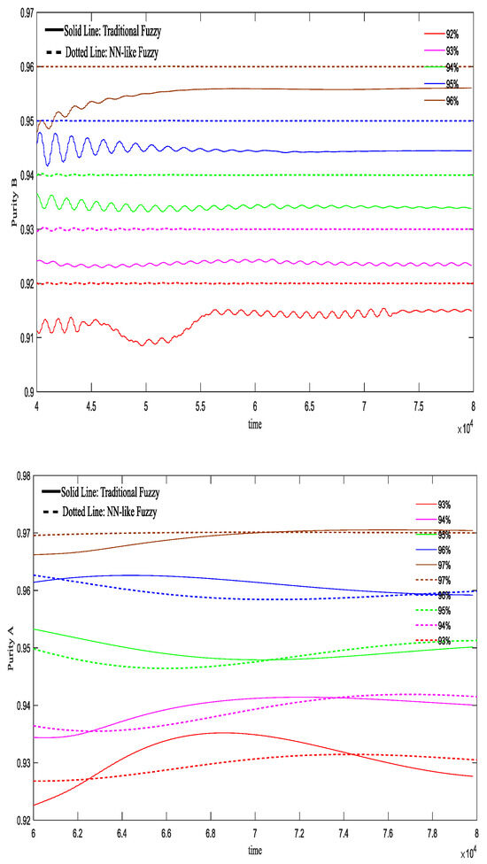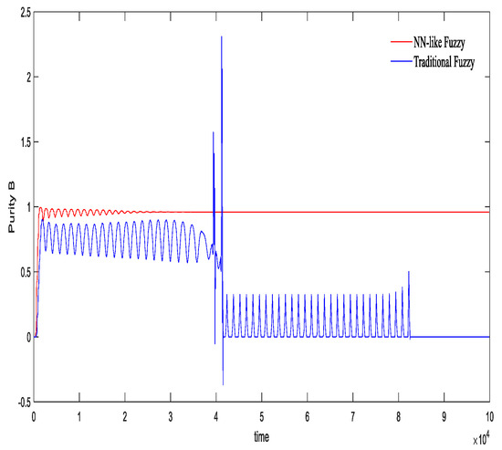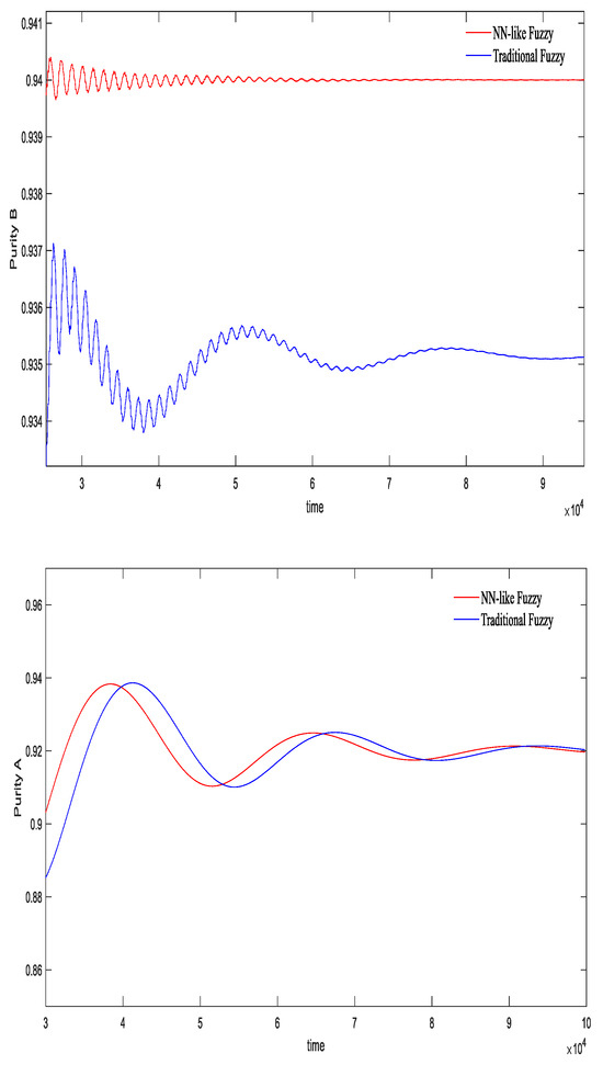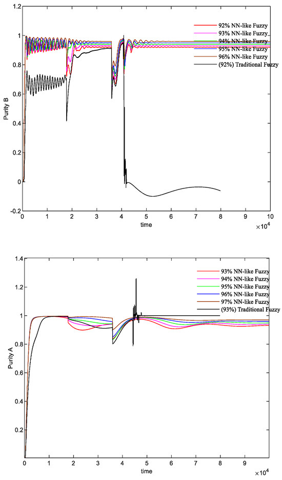 To verify the applicability of the NN-like fuzzy controllers in SMB control, we conducted several experiments on the purity control of the SMB system. Figure 10, Figure 11 and Figure 12 show the effects of material separation results for materials A and B located at the outlets of the extraction (material B) and raffinate (material A).