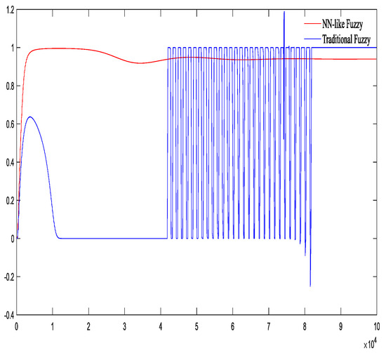From Figure 10, Figure 11 and Figure 12, it is evident that the NN-like fuzzy controller performs with high accuracy in controlling the purity of the extraction and raffinate outlet materials. The steady-state error in controlling the purity of the extraction solution’s outlet material and the raffinate solution’s outlet material is nearly negligible. The entire control process is quite stable, especially for the purity of raffinate outlet material A with higher sensitivity.