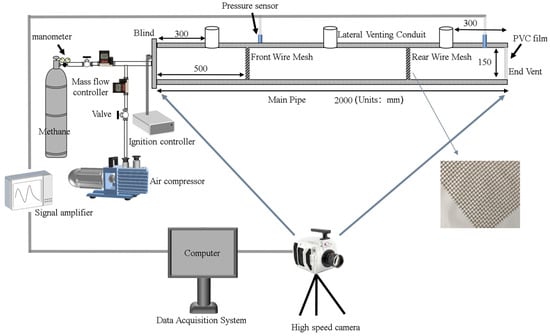 The pipe is composed of three sections of acrylic square tubes connected by flanges, with a total length of 2000 mm, a cross-sectional size of 150 mm × 150 mm, and a wall thickness of 20 mm. The left end is sealed with an acrylic blind plate, on which an air inlet/outlet valve and an ignition electrode are installed. The right end is open to vent explosions and ensure experimental safety. The gas distribution system includes a vacuum pump, a gas mass flow meter, and methane gas cylinders. The gas mass flow controller, model ALICAT (0~5 SLPM, ±1.0% F.S), controls the gas input flow rate. The pulsed ignition device was installed at the center of the acrylic blind plate at the left end of the pipeline. It is a self-made GNQ-05 model from Xi’an Kehui Thermal Engineering Technology Design Research Institute (Xi’an, China), with an ignition energy of 10 J. The high-speed camera used was the PHANTOM V1212-72G-C model (Vision Research, Inc., Wayne, NJ, USA), with a maximum shooting speed of 550,000 frames per second. In this experiment, a rate of 1000 frames per second was used, with a maximum resolution of 1200 × 800 pixels. The explosion pressure acquisition system consists of PCB 113A21 (PCB Piezotronics Technology (Beijing) Co., Ltd., Beijing, China) series piezoelectric pressure sensors, signal amplifiers, and a four-channel data acquisition card. The pressure sensor has a measurement range of 0 to 1.38 MPa. Two pressure sensors were installed on the side walls of the pipe at positions 600 mm and 1900 mm.