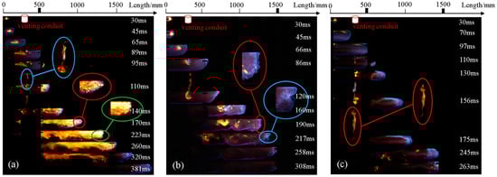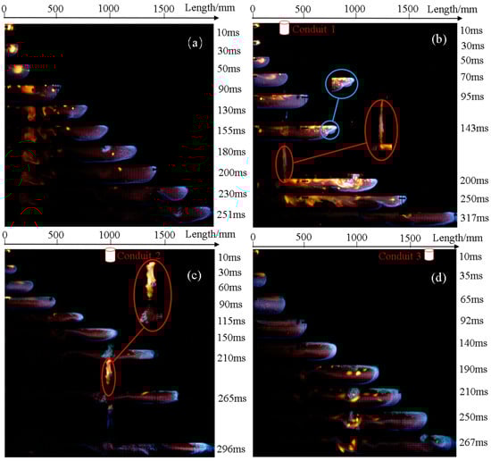 In Figure 2d, lateral Conduit 3 was installed with a venting port, but no flame was vented out from it. This is because lateral Conduit 3 was located near the end vent, and the venting effect at the end is stronger than the lateral venting effect, so the flame was quickly guided and released out from the end vent. Comparing the time required for the flame to propagate to the end vent under the lateral conduit conditions and the condition without conduits, the propagation times for lateral conduits 1, 2, and 3 were 317 ms, 296 ms, and 267 ms, respectively. The elongation ratios were 26.29, 17.92, and 6.37%, respectively.