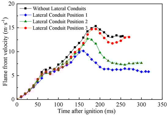 Figure 3 presents a flame propagation velocity–time diagram for different lateral conduit conditions. The flame’s instantaneous propagation velocity was obtained by dividing the distance traveled within a unit of time by the corresponding elapsed time. This was achieved by taking the average velocity between two consecutive images as the instantaneous velocity for the subsequent image. Consequently, a curve representing the variation of the flame front velocity concerning time was derived.