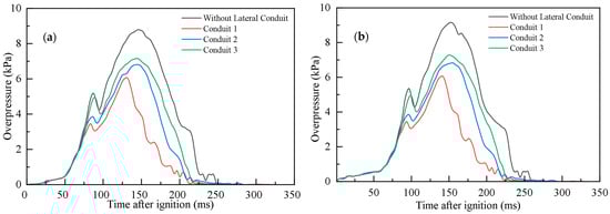 Overpressure–time diagrams of lateral blowdown conduits at different positions: (a) front overpressure; (b) back overpressure.