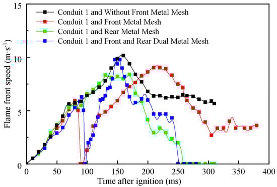 Figure 6 presents a flame propagation speed–time graph for several metal mesh placement scenarios. The propagation in the single rear metal mesh scenario is similar to that in a pipeline with only a side relief duct installed. The difference is that the presence of the rear metal mesh can reduce the flame propagation speed in the latter part of the pipeline and successfully extinguish the flame. The premixed flame moves downstream along the pipeline. Due to the presence of a metal mesh in the middle and rear sections of the pipeline, flow resistance is formed in the unburned area, thereby generating a reactive force that inhibits flame propagation. Meanwhile, as the flame continues to vent through the side duct, the flame and fuel inside the pipeline become very diluted, fully utilizing the quenching performance of the metal mesh, i.e., the flame’s speed drops to 0 m/s when it propagates to 1500 mm in the pipeline.