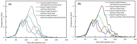 The overpressure–time diagram under operating conditions in metal mesh within the pipeline in coordination with the side venting duct in position 1: (a) front overpressure; (b) back overpressure.