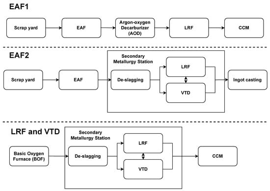 The location of each process EAF1, EAF2, LRF, and VTD, with respect to the upstream and downstream processes in each steel plant.