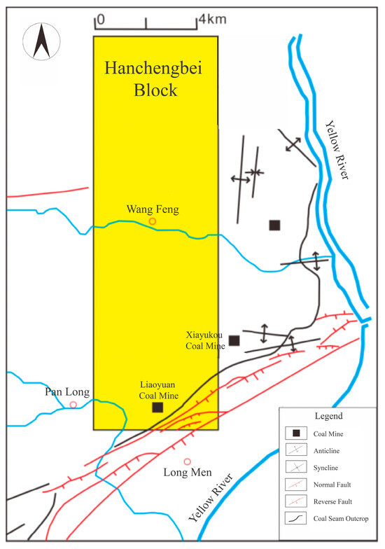 The Hanchengbei lock is situated on the eastern margin of the Ordos Basin and is minimally affected by shallow uplift fault structures, primarily in the southeastern part of the block (Figure 1). The research area is adjacent to the Yellow River, with rivers passing through the middle. Affected by multiple faults in the southeast, some coal seams are exposed. While there are few fault occurrences, their impact on coal seam distribution and vertical development is limited. The geological structure is relatively straightforward, with the strata sloping higher to the southeast and lower to the northwest, presenting an overall monocline structure. The Hancheng North block primarily consists of coal-bearing strata from the Shanxi Formation and Taiyuan Formation. Among these, the No. 5 coal seam in the Shanxi Formation and the No. 11 coal seam in the Taiyuan Formation, due to their stable development and considerable thickness across the entire region, are the main exploration and development horizons within the study area.