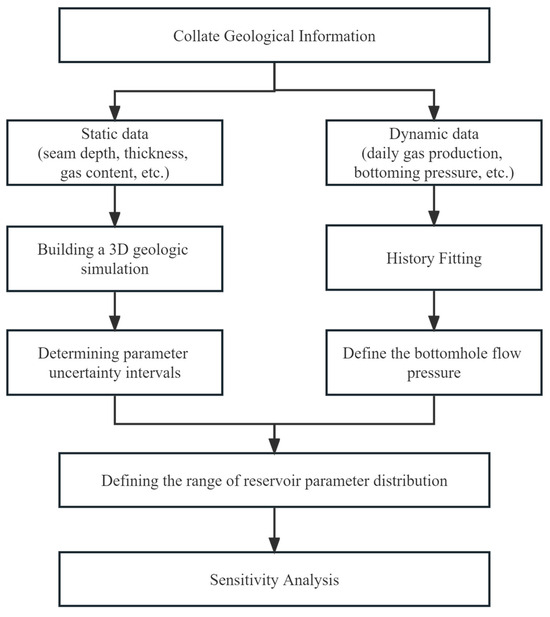 Coalbed methane production capacity simulation is a vital method for evaluating the effectiveness of coalbed methane development and analyzing the factors that impact coalbed methane production. In this simulation, we employed the coalbed methane numerical simulation software Comet3 [26,27]. We used a coal reservoir model with dual porosity, single permeability, two-phase, and single-component adsorption. The software’s internal Monte Carlo simulation module was used to analyze the primary controlling factors influencing coalbed methane production. The workflow is as follows (Figure 2):