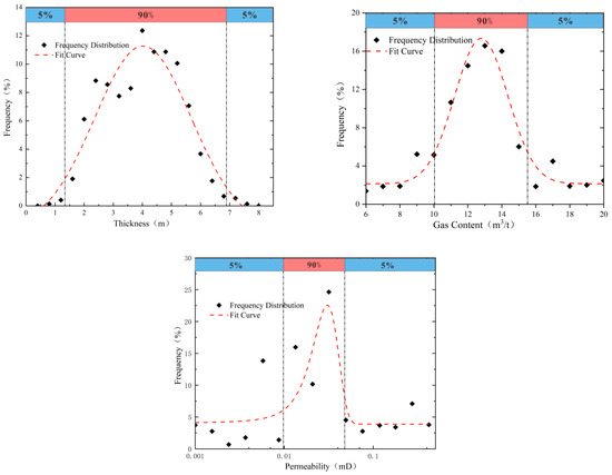 Based on the modeling results, the distribution of various geological parameters is analyzed. Normal distribution functions are established to represent the uncertainty of parameters influencing coalbed methane production. Uncertainty estimates are made for each parameter, and the P5–P95 range is selected as the confidence interval to provide a range for subsequent simulations. The conclusions are drawn as follows: the main distribution range of the thickness of Coal Seam 5 in Hanchengbei Block is [1.35, 6.89]; the gas content is mainly distributed between 10.28–15.52 m3/t; the permeability is relatively low, mostly between [0.014, 0.048].