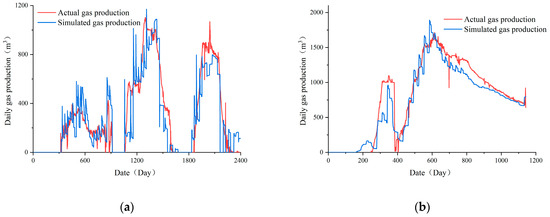 History fitting is a prerequisite for numerical simulation work, and in this paper, history fitting work is carried out for two representative wells in the study area, and the results show that the fitting effect is better (Figure 12). This historical fitting utilized Well W1 within the Hanchengbei Block as the reference well. Well W1 is a representative well situated in the central part of the research area, producing from the combined mining of the 5th and 11th coal seams. The continuous production from this well has yielded favorable output. The controlled area for a single well covered 0.616 km2, and the well was designed as a dual-layer combined mining well. During the simulation process, a single parameter was varied in each simulation, while the other parameters were kept constant. The fitting parameters for this well are shown in the table below (Table 1) [34].