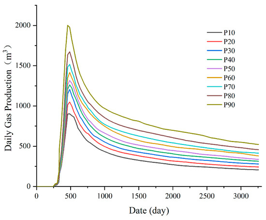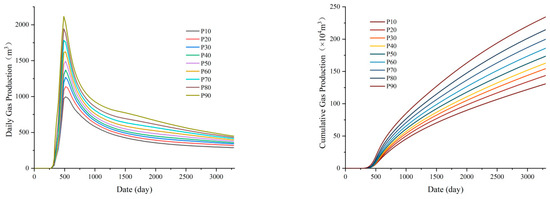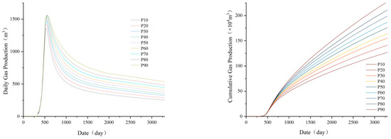 Due to the joint influence of multiple factors on the production capacity of coalbed methane, a comprehensive analysis was conducted on the three influencing factors mentioned above. By utilizing the variation range of various geological factors in Coal Seam 5, a model was imported for numerical simulation to obtain the variation range of production capacity in the Hanchengbei Block (Figure 20). From the figure, it can be seen that the study area is affected by geological factors, and the gas production time of coalbed methane wells is roughly the same as the time to reach the peak gas production, which has a significant impact on the peak gas production. The peak production capacity varies from 900–2100 m3/d, and the average gas production is between 310–730 m3/d. Selecting a gas production rate with a cumulative probability of 50% as the most likely production capacity of the Hanchengbei Block, the highest gas production rate was 1315 m3/d, and the cumulative gas production per well was 158.12 × 104 m3.
