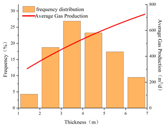 In coalbed gas development, coal seam thickness determines the quantity of resources and subsequently affects the production rate of individual gas wells. To study the impact of coal seam thickness, a production forecasting model was established for the joint development of two coal seams. A relevant Monte Carlo model was set up for simulation. The thickness of the 5th coal seam ranged from 1.38 m to 6.89 m, and the thickness of the 11th coal seam was 2.1 m. The predicted results, as shown in Figure 14, indicate that with an increase in the thickness of the fifth coal seam, the gas production peak increases. The time to reach gas, gas production rate, and subsequent productivity decline trends remain unchanged. The cumulative gas production uniformly increases as coal seam thickness increases. There is a positive correlation between average gas production and coal seam thickness, with a range of 380 to 720 m3/d. The daily average gas production varies within a range of 340 m3 (Figure 15). This is because an increased coal seam thickness leads to higher initial resource volumes, while the gas content in the reservoir remains unchanged, resulting in an increase in the gas production peak, with no change in the time to reach the gas.
