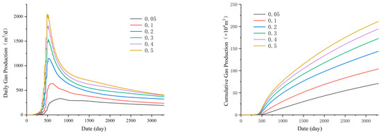 Coal seam permeability is a crucial parameter controlling the flow of fluids within the reservoir. The greater the permeability of the reservoir, the easier it is for gases to flow from the reservoir to the wellbore, resulting in an increased gas production rate. The study area consists of low-permeability reservoirs, with permeability ranging from 0.01 to 0.5 mD. Figure 18 illustrates the impact of different permeabilities on gas production. The permeability of the 5th coal seam varies between 0.05 mD and 0.5 mD, while the 11th coal seam has a permeability of 0.2 mD. The predictive results, as shown in Figure 15, indicate that reservoir permeability has a significant influence on gas behavior. With higher reservoir permeability, drainage efficiency is enhanced, resulting in earlier gas production, higher gas production rates, and higher production peaks. Within the range of 0.05 mD to 0.5 mD, the average gas production increases from 200 m3/d to 620 m3/d, with a substantial variation of up to 420 m3 (Figure 19).