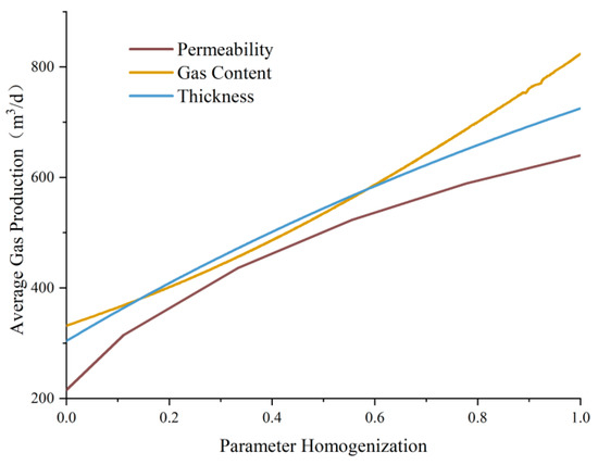 Under this production system, coal seam thickness, gas content, and permeability are all positively correlated with average gas production. When assessing the influence of individual geological parameters on average gas production, permeability exhibits the greatest sensitivity, followed by gas content and thickness. After normalization, the changes in average gas production within the range of different parameter variations in the study area show that gas content has the strongest sensitivity, followed by thickness and permeability (Figure 21). This is because although permeability has the most significant impact on gas production, the study area primarily consists of low-permeability reservoirs, resulting in a limited range of permeability variation and, thus, a more moderate impact on coal seam gas production.