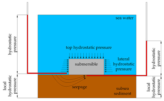A model of a submersible sitting on a seabed is shown in Figure 1. When the submersible sat on the seabed, it was surrounded by hydrostatic pressure. The hydrostatic pressure difference between the top and bottom is an important factor of the bottom-sitting adsorption effect. Normally, the hydrostatic pressure on the bottom is higher than that on the top; this is the reason why the buoyancy of a submersible could occur. However, the hydrostatic pressure on the bottom would reduce due to the seepage effect of the seabed soil, when a submersible is sitting on the seabed. It is possible that the hydrostatic pressure on the bottom is lower than that on the top. Therefore, the buoyancy of the submersible would disappear, and the bottom-sitting adsorption effect would occur.