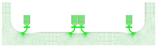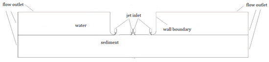In order to reveal the mechanics of whether water jets can eliminate the bottom-sitting adsorption effect of a submersible, a two-dimensional calculation was first carried out. Through computational iterations, the final design of the 2D computational model was determined, as shown in Figure 4. A square wall condition was established to simulate the submersible’s boundary, while a two-phase medium model of water and soil was constructed to simulate the physical state of the seabed sediment. There were four horizontal nozzles under the bottom of the submersible, The nozzles at different positions were used to analyze the specific jet characteristic, which would be used to guide the three-dimensional calculation and test design. The local area meshing at the nozzles is shown in Figure 5.