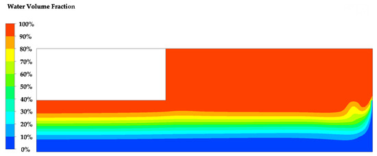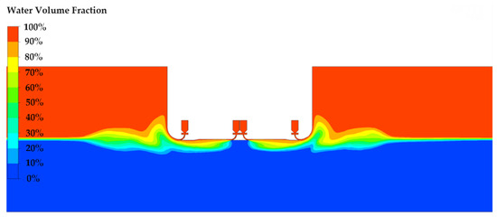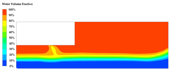 The velocity of the pulse jet was controlled from 1.97 m/s to 3.94 m/s, and the maximum velocity was consistent with that of the continuous jet. Figure 12 and Figure 13 show the two-phase distribution caused by the two pulse jets with a circulation period of 4 s, and Figure 14 shows the thickness of the water film and liquefied soil of different jet types. It can be seen that the rectangular pulsed jet produced a max thickness of the water film and liquefied soil because it has a stable jet energy and disturbance ability, which is beneficial for liquefying soil under the submersible’s bottom.